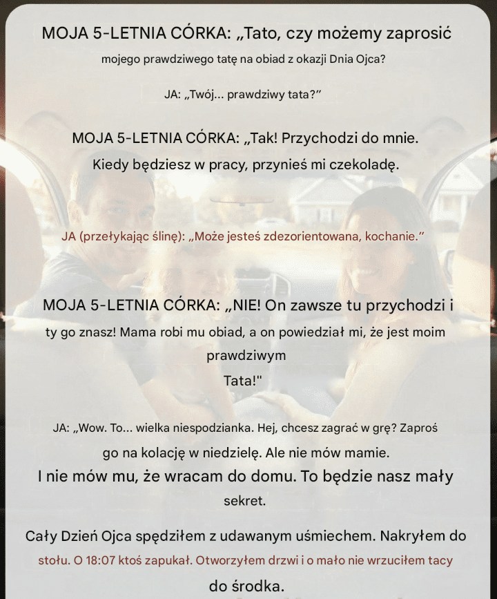 Nic w głosie Lily nie brzmi dramatycznie ani napominająco. Zadajesz to pytanie tak samo, jak prosiłbyś o dodatkową pomoc w domu czy o cokolwiek innego. Wpadka pojawiła się w pokoju jako zwykły fakt z jej życia, coś, co zmyśliła, coś, co już wiedziałem. To właśnie najbardziej mnie zaniepokoiło. Jej niewinność jest lustrem, odbiciem przepaści między światem, w którym żyła, a tym, który, jak mi się wydawało, dzieliliśmy. Kiedy zareagowała na „niespodziankę z okazji Dnia Ojca”, poczułem, jak coś we mnie drży, jakby drżało. Kieruje tym delikatnie, zadając jedno ostrożne pytanie za drugim, starając się nie ujawniać, jak szybko bije mi serce.