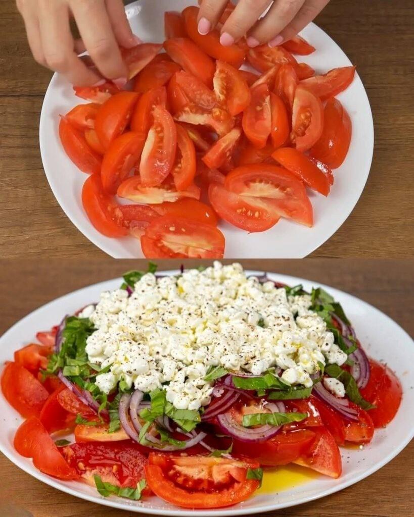 To przepis na sałatkę, która jest kwintesencją świeżości i prostoty. To zachwycające połączenie soczystych, dojrzałych pomidorów i kremowego, pikantnego twarogu, tworzące pełne życia i zdrowe danie, które jest równie sycące, co łatwe w przygotowaniu. Ta sałatka, będąca kwintesencją świeżych, wysokiej jakości składników, nie wymaga gotowania i minimalnego przygotowania, dzięki czemu idealnie nadaje się na lekki lunch, szybką przekąskę lub orzeźwiający dodatek. Dzięki lekkiemu i pikantnemu dressingowi z oleju roślinnego i octu jabłkowego oraz aromatycznemu dodatkowi świeżej bazylii, ta sałatka jest dowodem na to, jak kilka prostych składników może połączyć się, aby stworzyć naprawdę pyszny i pożywny posiłek.