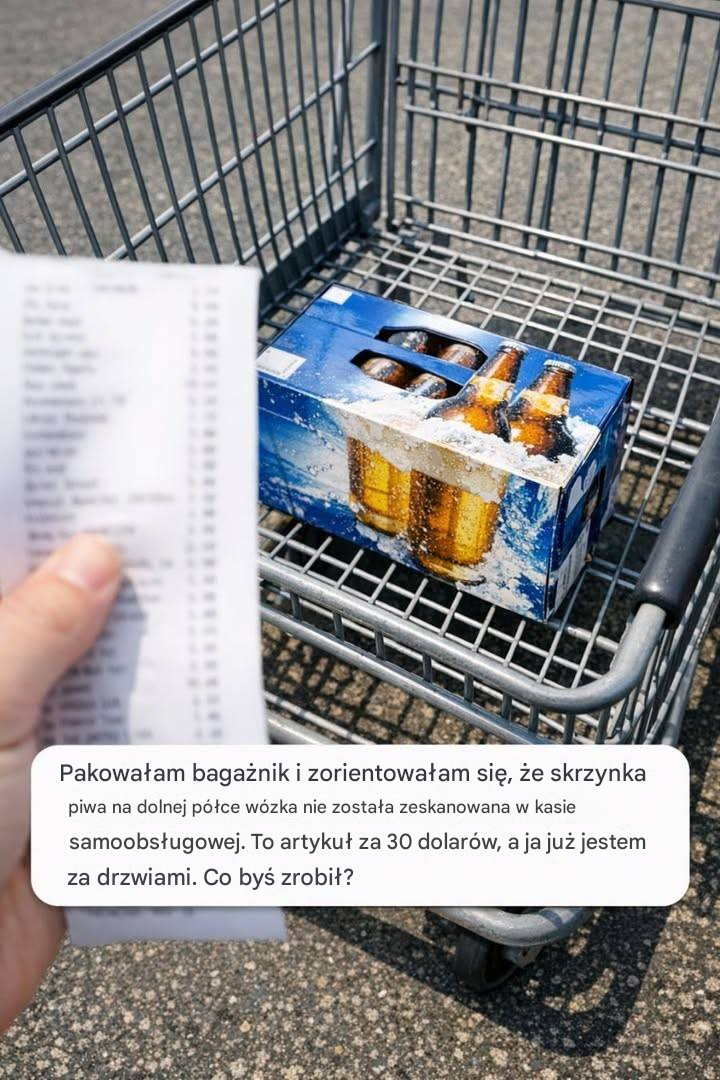 Pakowałam bagażnik i zorientowałam się, że skrzynka piwa na dolnej półce wózka nie została zeskanowana w kasie samoobsługowej. To artykuł za 30 dolarów, a ja już jestem za drzwiami. Co byś zrobił?