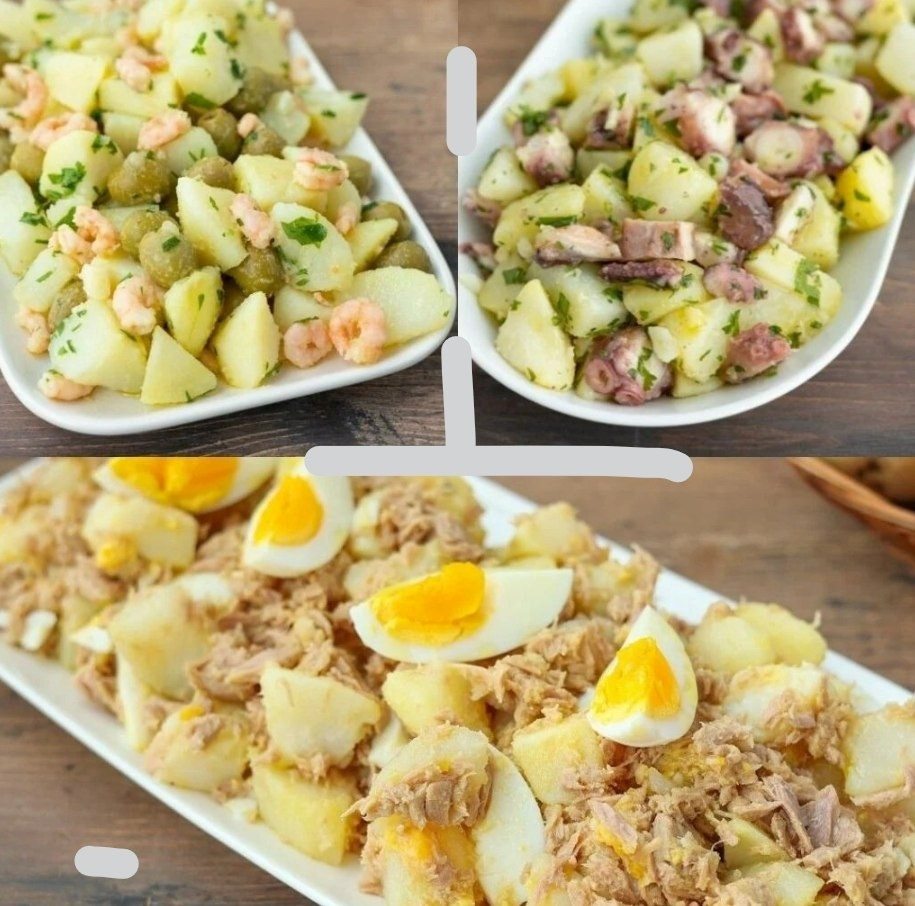 Sałatka ziemniaczana: 3 szybkie i łatwe przepisy Składniki Sałatka z ziemniaków, krewetek i oliwek 600 g gotowanych ziemniaków 100 g gotowanych krewetek 100 g zielonych oliwek bez pestek pietruszka do smaku oliwa z oliwek do smaku drobna sól do smaku Sałatka z kalmarów i ziemniaków 600 g gotowanych ziemniaków 250 g gotowanych kalmarów, czosnek, posiekana pietruszka do smaku, oliwa z oliwek do smaku, drobna sól do smaku Sałatka z ziemniaków, tuńczyka i jajek 600 g gotowanych ziemniaków 200 g odsączonego tuńczyka z puszki, 4 jajka na twardo, oliwa z oliwek do smaku, sól do smaku![]()