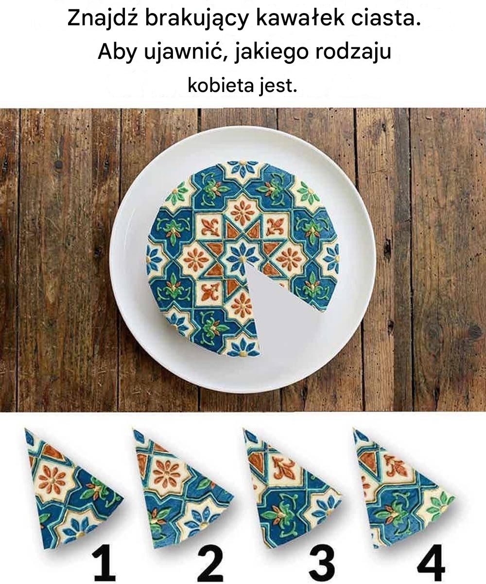 Wizualne łamigłówki osobowości oparte na wyborach stały się niezwykle popularne, ponieważ łączą w sobie obserwację, intuicję i odrobinę autorefleksji. Zdjęcie powyżej przedstawia pięknie udekorowany tort z brakującym kawałkiem. Poniżej znajdują się cztery różne kawałki, które idealnie pasują do pustej przestrzeni.